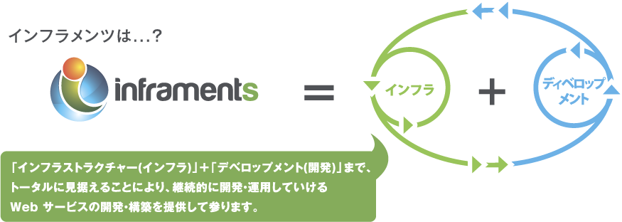「インフラストラクチャー(インフラ)」+「デベロップメント(開発)」まで、トータルに見据えることにより、継続的に開発・運用していけるWeb サービスの開発・構築を提供して参ります。